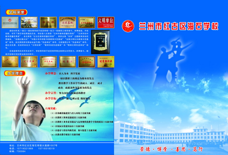 以人为本 科学管理 与时俱进 开拓创新 爱岗奉献 求真务实 教改先锋 名师荟萃 文化沃土 育人摇篮 质量上乘 桃李芬芳 长足发展 陇原名校