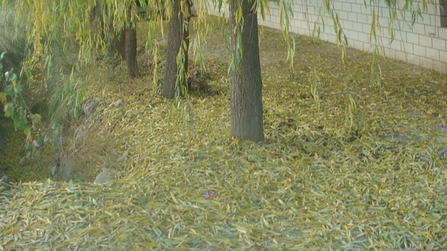 又过了几天,叶子纷纷从枝头飘落,像一个个色彩斑斓的蝴蝶一样,它们义无反顾的从枝头飘落下来,知道静止在大地上。一阵风吹过,树叶纷纷落下,一片片各种颜色树叶铺成了一条花色的"地毯",看上去美丽极了。