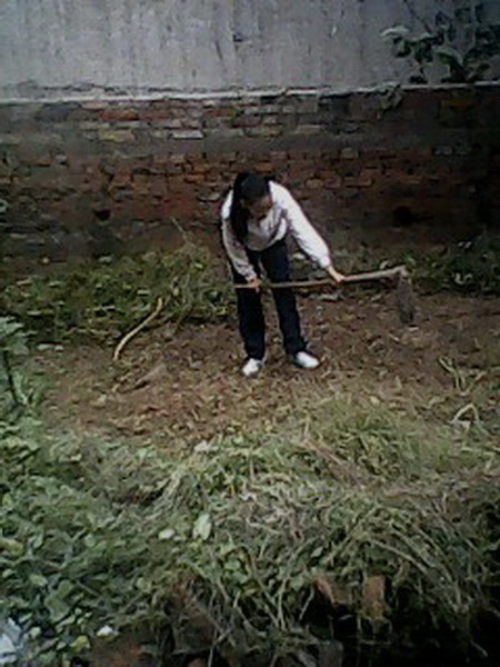 我拿起空地的另一边的锄头,并学着外婆锄地的样子。外婆举起锄头,用力插在地里,用力一提。我也跟着她做。举起锄头,用力插在地里,可是,锄头却歪了。我是了很多遍还是那样,还满头大汗。我不干了!