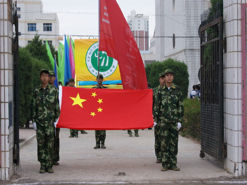 鲜艳的五星红旗的四角津津地攥在戴洁白的手套的同学手里。这些身穿迷彩服的同学英姿飒栓地走在队伍的最前面。
