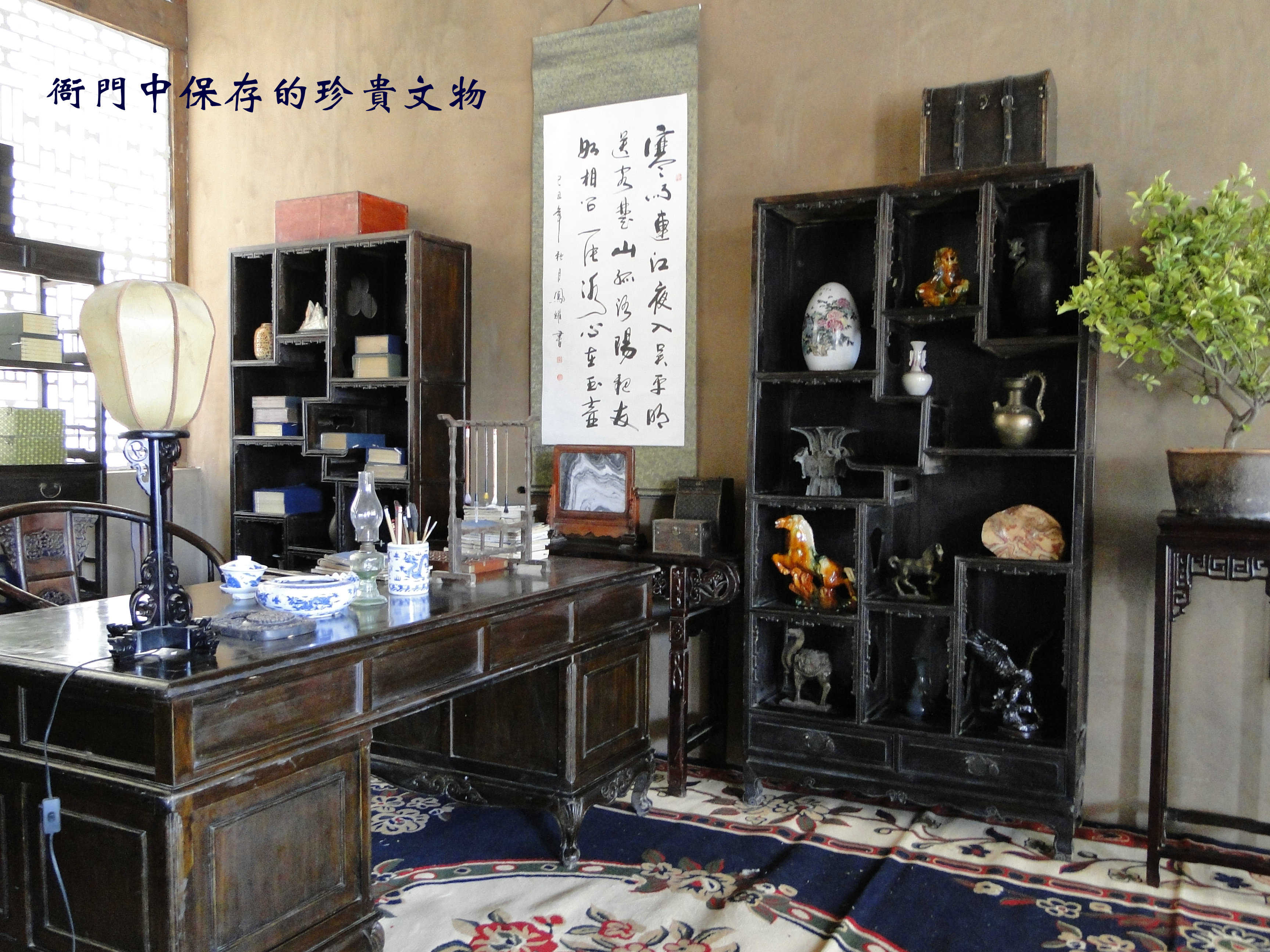 燕喜堂后面是一间专门为拍戏而准备的房子,里面有38张影视照片,《射天狼》、《黄石的孩子》等就在其中展出。门外还有一个大水缸,这个水缸是古代人民的消防工具。二堂后面是一座木楼,木楼上有书房、观景台,从木楼上望,可以看到对面妙因司塔顶的两只金狮子。这里还有祖先堂院,又称作“神堂院”,是供奉祖先牌位的地方。中央放置着许多历代皇帝和大臣的牌位,墙上有这些人祖先的简介,一件件震撼人心的事件深深的印在了我的脑海里。