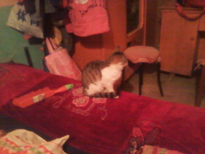 我家这只猫,是在我看电影的时候捡到的,它是一个"流浪者",我看它可怜,我就收留了他它,这只猫开始看见我有点害怕,可是我给了它些肉,这只猫一见肉就像疯子一样迅速从我的怀里跳下去叼起肉就跑,就真像一个的狼狈的小狗啊!我看了给出它的评价是:一只小馋猫,呵呵!