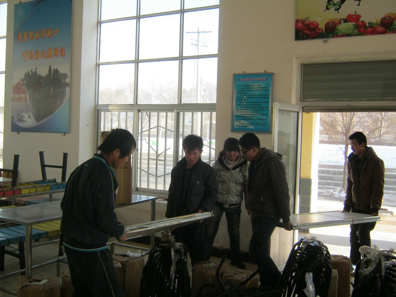 同学们,兴高采烈地一边搬东西一边在谈论着,都为能在干净卫生的餐厅里吃饭感到高兴。