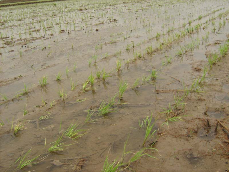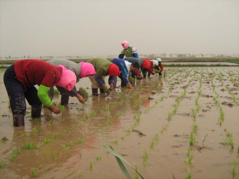插秧要有一定的技巧。株数大约三到五株,只将根部插入泥中即可。看!这是乡亲们组织起来插秧的情景。他们沿着一条绳子插,这样可以使秧苗成一条线,以便更好的通风。他们每插一条线,两头的人就把线往后挪动三十公分接着插,就这样依次轮流即可。