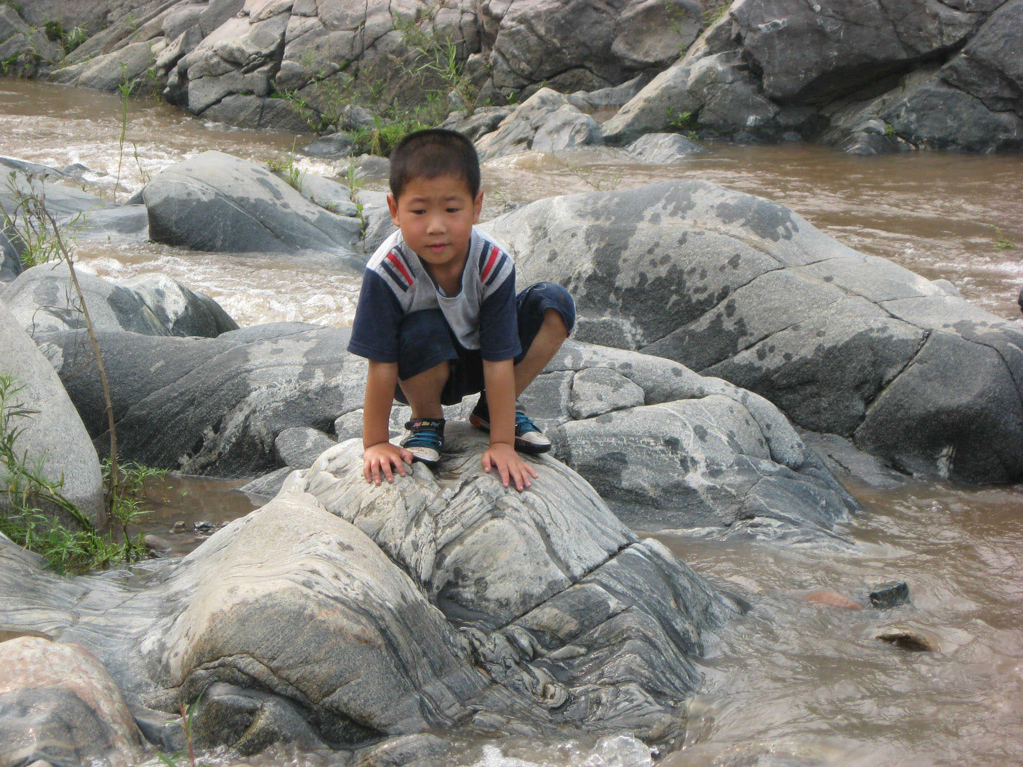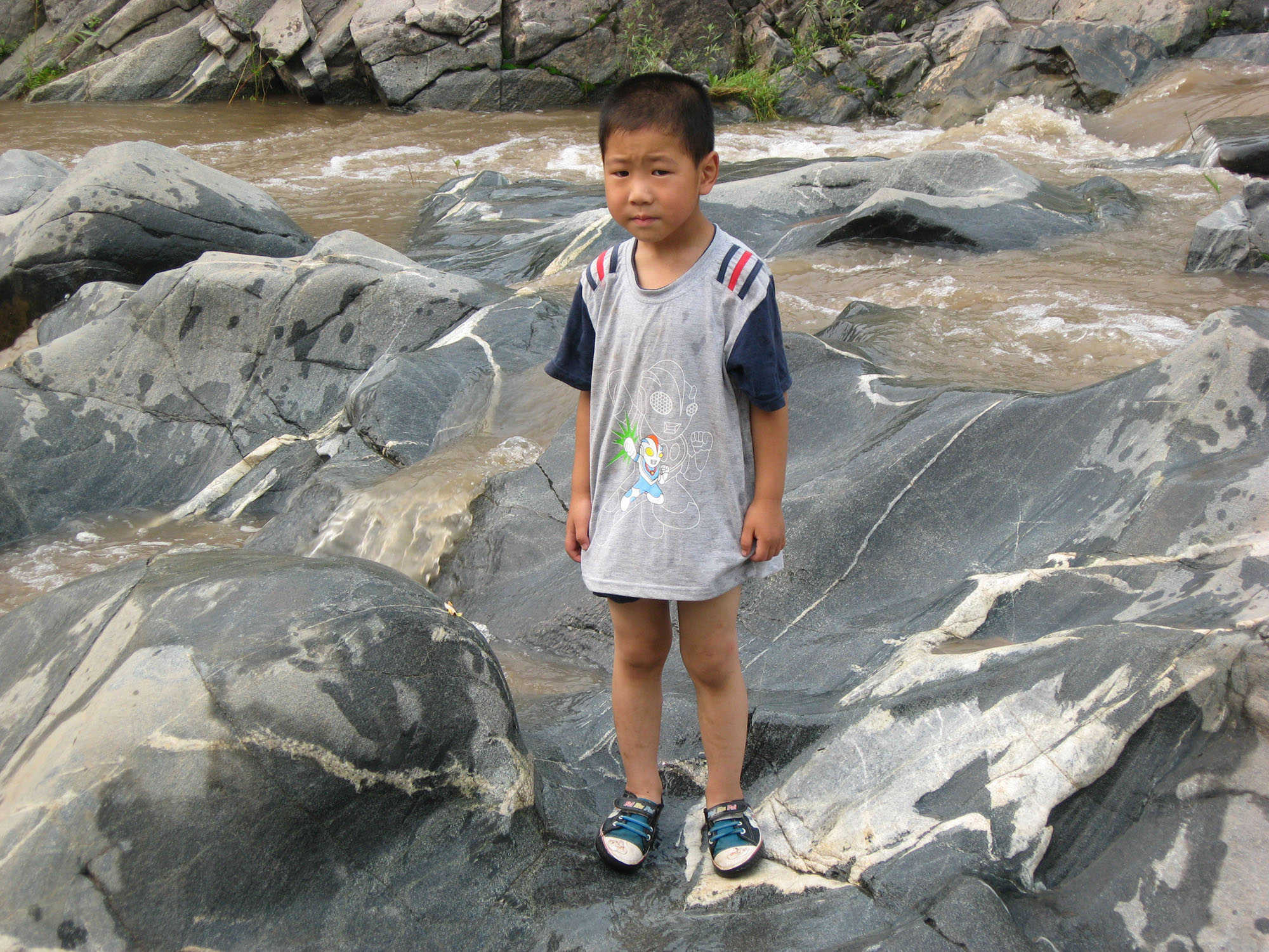 这条河有个地方与众不同。其它的地方的河床多为泥沙,而这条河有一段河床却是石头的。由于河水长年累月的冲刷,这些石头的形状各异。有的还有深深的沟。