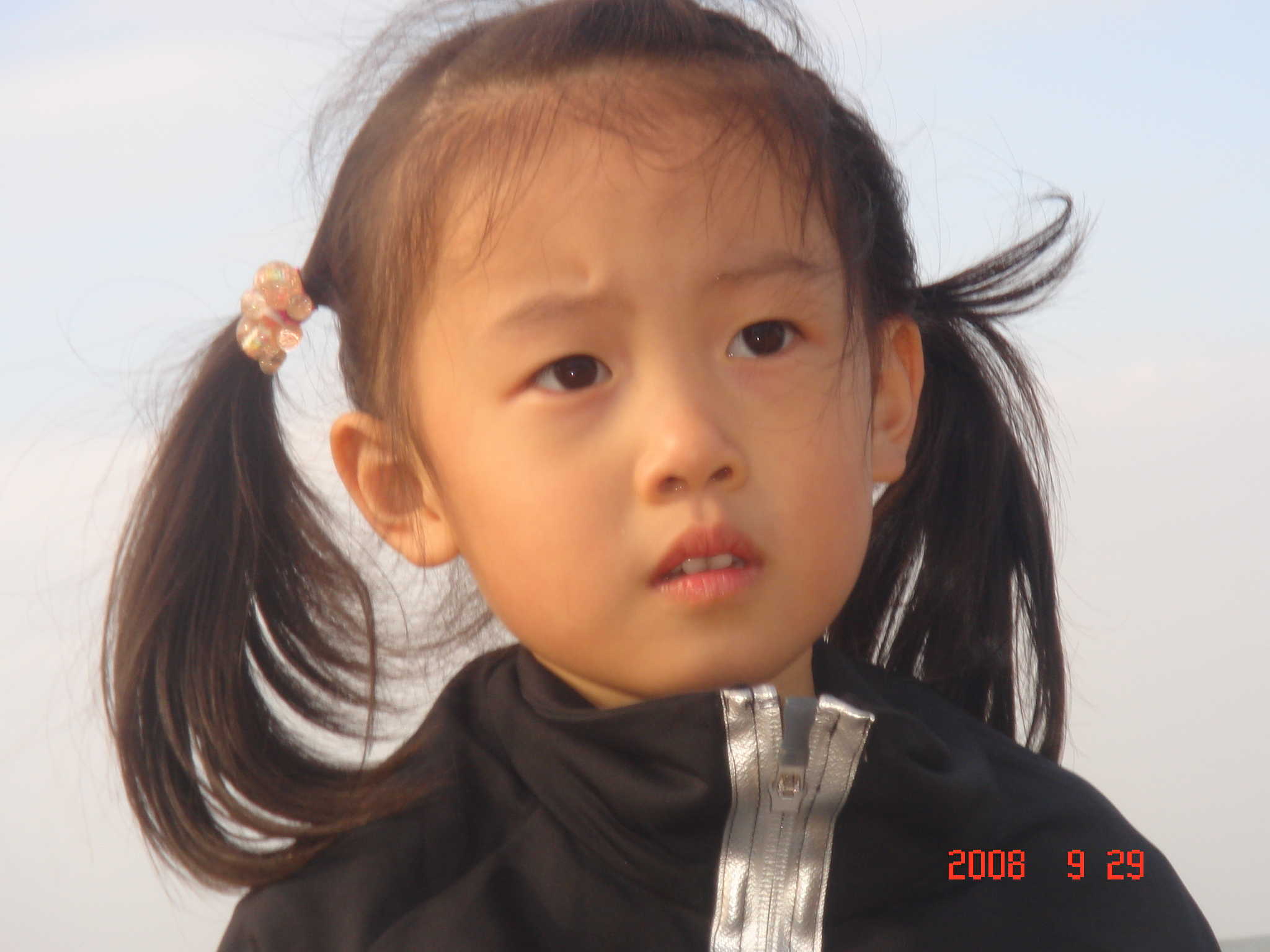 但你千万不要被这可爱的模样给蒙骗了!她看上去文静,但她比谁都调皮。比如这张照片上,她十分文静,这是她在做了坏事以后才表现出啥事也没有的样子:她手捏了一把泥沙,使劲全身力量来向我发射大炮。弄得我成了一个泥人。事后我找她算账,她就装出一副可怜兮兮的样子。让我同情。哎!