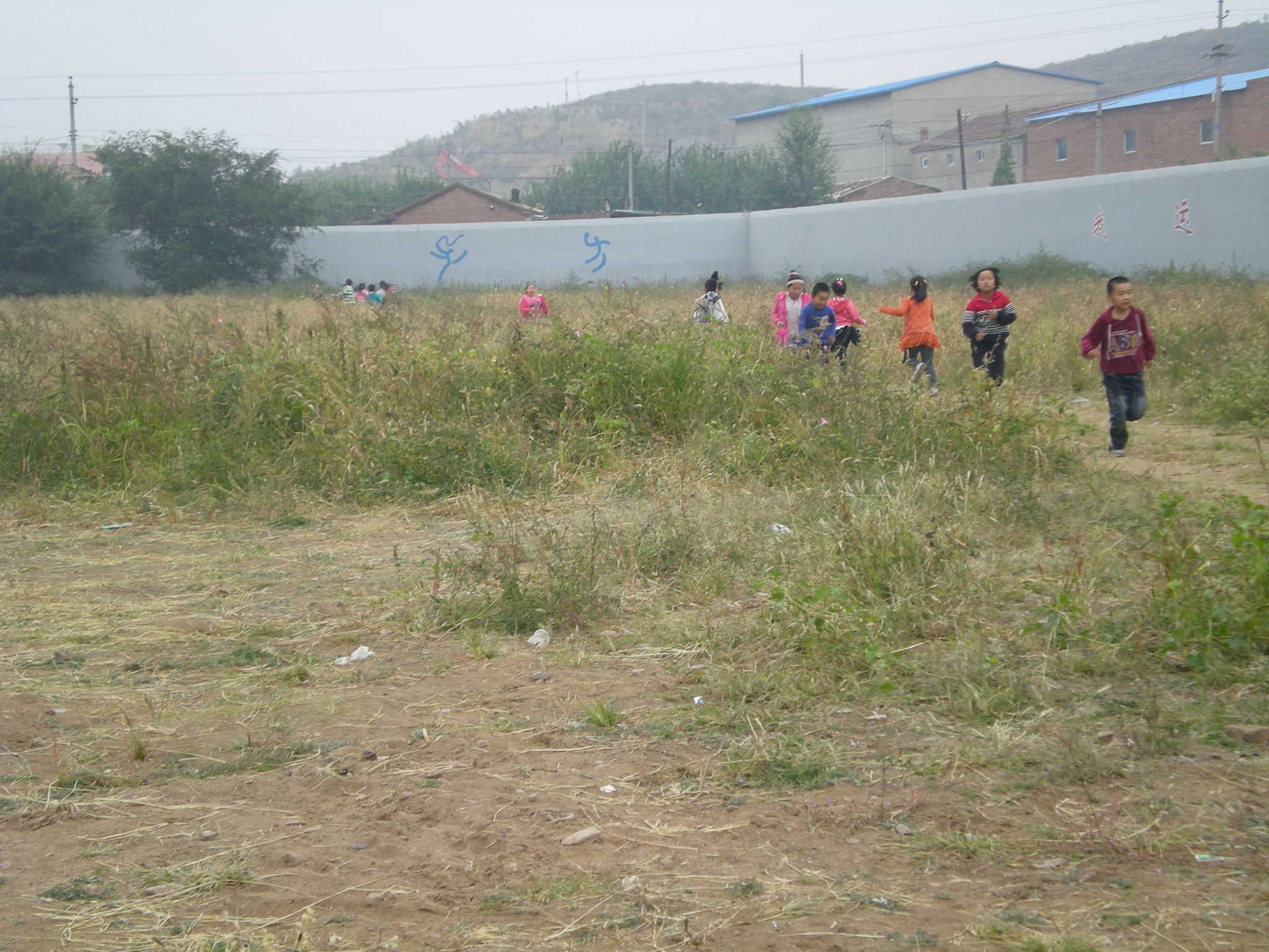 操场上的草长得很高很茂盛,都没过我们的腿了。我们再也不能在操场上玩儿了,开学初老师带着我们拔掉一些草,只开辟了一小片我们活动的场所。四周是草,草中央一片平整的游乐地,在那里玩儿特别开心,我们在这儿跳皮筋,我们在这儿喝毽子。