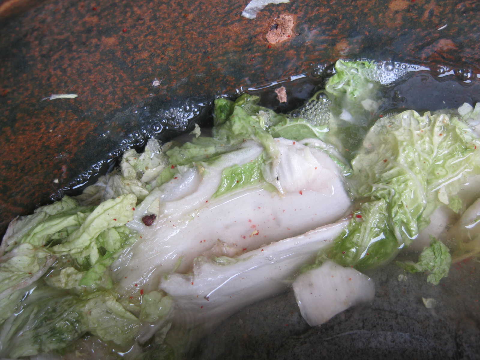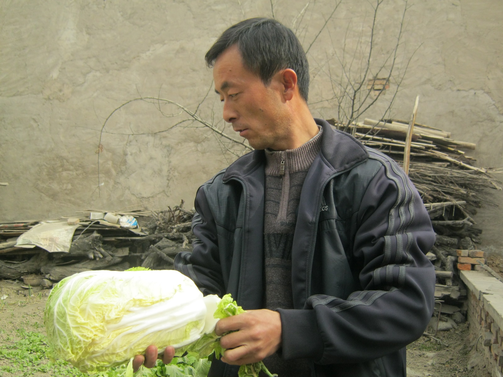 买来的白菜不能直接腌,要放在屋檐下晾晒几天,我们把买来的白菜堆在墙边,每天太阳晒着它们,很快外面的叶子就不那么新鲜了,白菜也蔫了许多。
