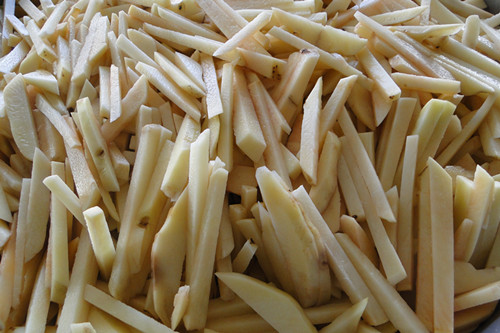 我们先把平底锅放在火炉上热一下,再倒上一些油,把马铃薯切成条,等油烧热,放入切好的马铃薯,在锅中翻炸,直到它的颜色变成金黄为止。炸好之后,在上面撒一些胡椒粉,这样一碟香喷喷的诱人的土豆条就做好了。我们当地人把这叫炸洋芋,我看有些地方叫他薯条。