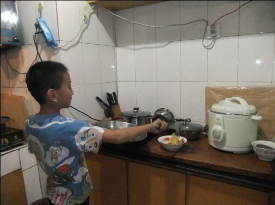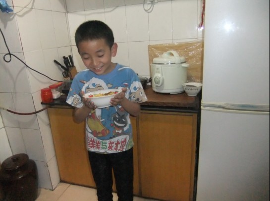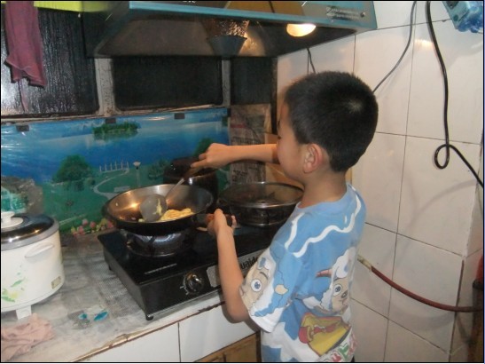 中午爸爸打电话说:"待会你饿了就出去吃牛肉面。"我听了就说:"爸爸,我现在都长大了,早就应该学会自己做饭了。"在我的请求下爸爸无奈的答应了。挂了电话,我兴奋的跑进厨房转了一大圈,我却不知道该做什么吃,忽然我看见案板上的一袋鸡蛋,于是我打算炒鸡蛋。我揭开锅盖到入适量的清油,然后拿出一个碗,再拿了几个新鲜鸡蛋,学妈妈打破鸡蛋,将蛋清蛋黄都倒入碗里,搅拌均匀后倒入热油锅里,就开始炒了,等鸡蛋炒成饼状后就可以出锅了。