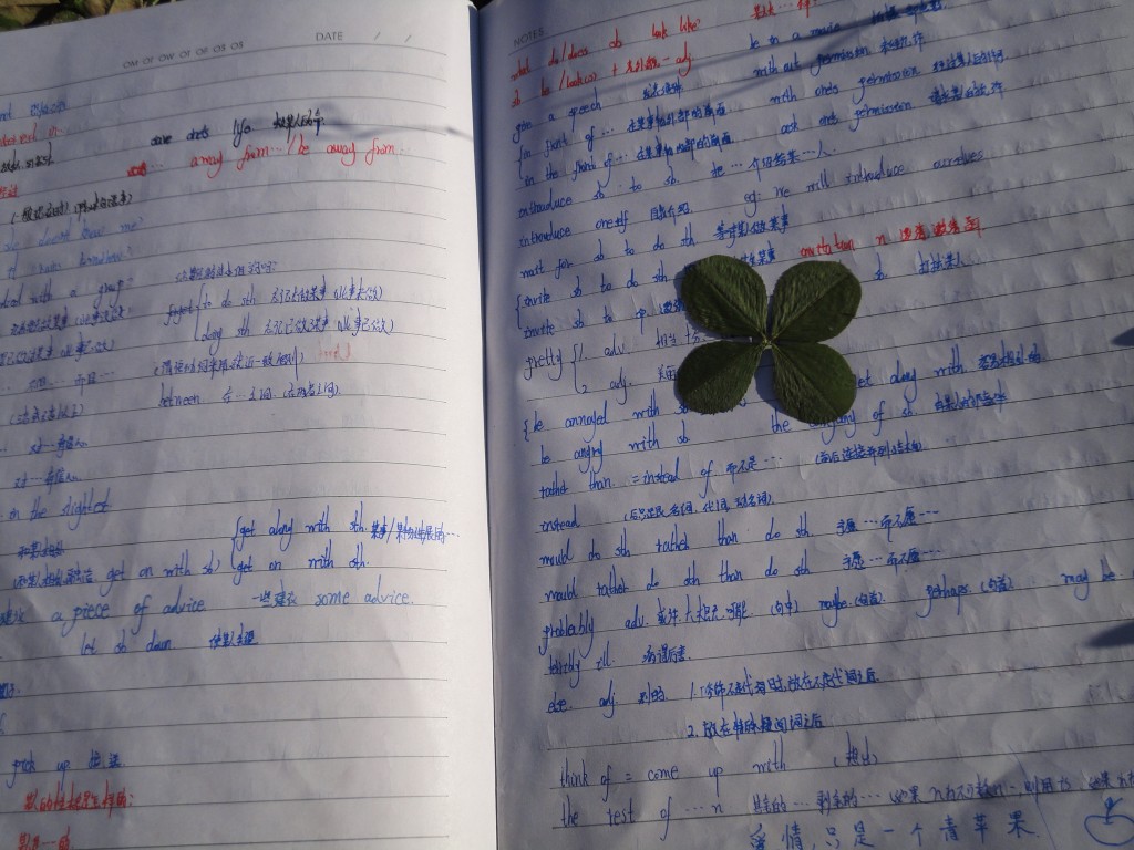 一天,玲子看见我一个人在教室里偷偷流泪,她跑到我身边硬生生的把我拉到教室门外,“走,我带你去看一种草。”我还没反应过来就被她拉到了草坪前,“看,这是一株三叶草,这可是一株幸运草。”她扮着鬼脸俏皮地说,“拥有三叶草的人,会得到天使的祝福。”我极不情愿的瞥了一眼草坪,雨过天晴,一株株三叶草嫩的逼人的眼,这旺盛的生命从来都不向狂风暴雨低头,我忽然觉得它这么嫩绿都源自于暴风雨的洗礼。我伸手摘了一朵三叶草,架在我的笔记本里,希望它能给我好运,给我坚强。