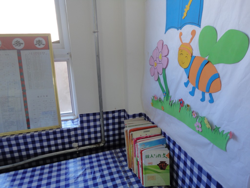 我们班的图书角颇具特色,是一幅很漂亮的图画,绿色是代表着希望的颜色,那我们的图书角自然少不了绿色,那一角绿色的草地跃然墙上,又在上面点缀着各色小花,星星点点,着实好看,不过这都只不过是配角罢了,真正的主角还没有出场呢。其实正真的主角是两朵粉红色的大花,屹力与草地之上,旁边还有一只飞来采蜜的大蜜蜂呢,这只蜜蜂高兴地笑着,样子很可爱。