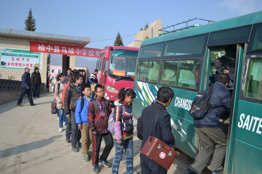 当日下午3点,2辆客运大巴停在马坡中学门口,等候学生放学,送孩子们安全回家。简短的开车仪式后,在护送老师的组织下,学生们胸前挂着乘车牌有序地坐上了回家的班车,个个兴高采烈。