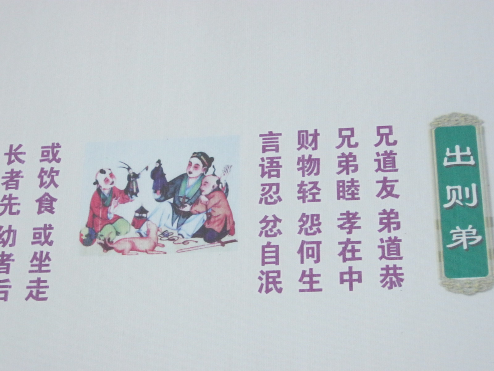 其中我最喜欢第二章《出则悌》,它的大概意思是当哥哥姐姐的要对弟妹友爱,作弟妹的要懂得恭敬兄姐,这样兄弟姊妹才能和睦相处,一家人也就和乐融融,父母自然欢喜,孝敬就在其中。我们要与人相处不斤斤计较财物,怨恨就无从生起。言语能够包容忍让,多说好话,不说坏话,忍住气话,那么不必要的冲突、怨恨的事情自然就消失不会发生。现在越来越多的都是独生子女了,没有了兄弟姐妹,更不懂得与人相处,所以很有必要进行这方面的教育。