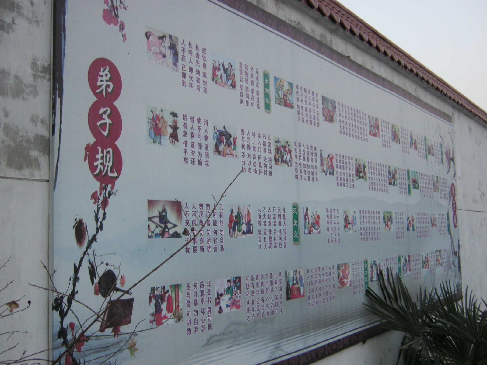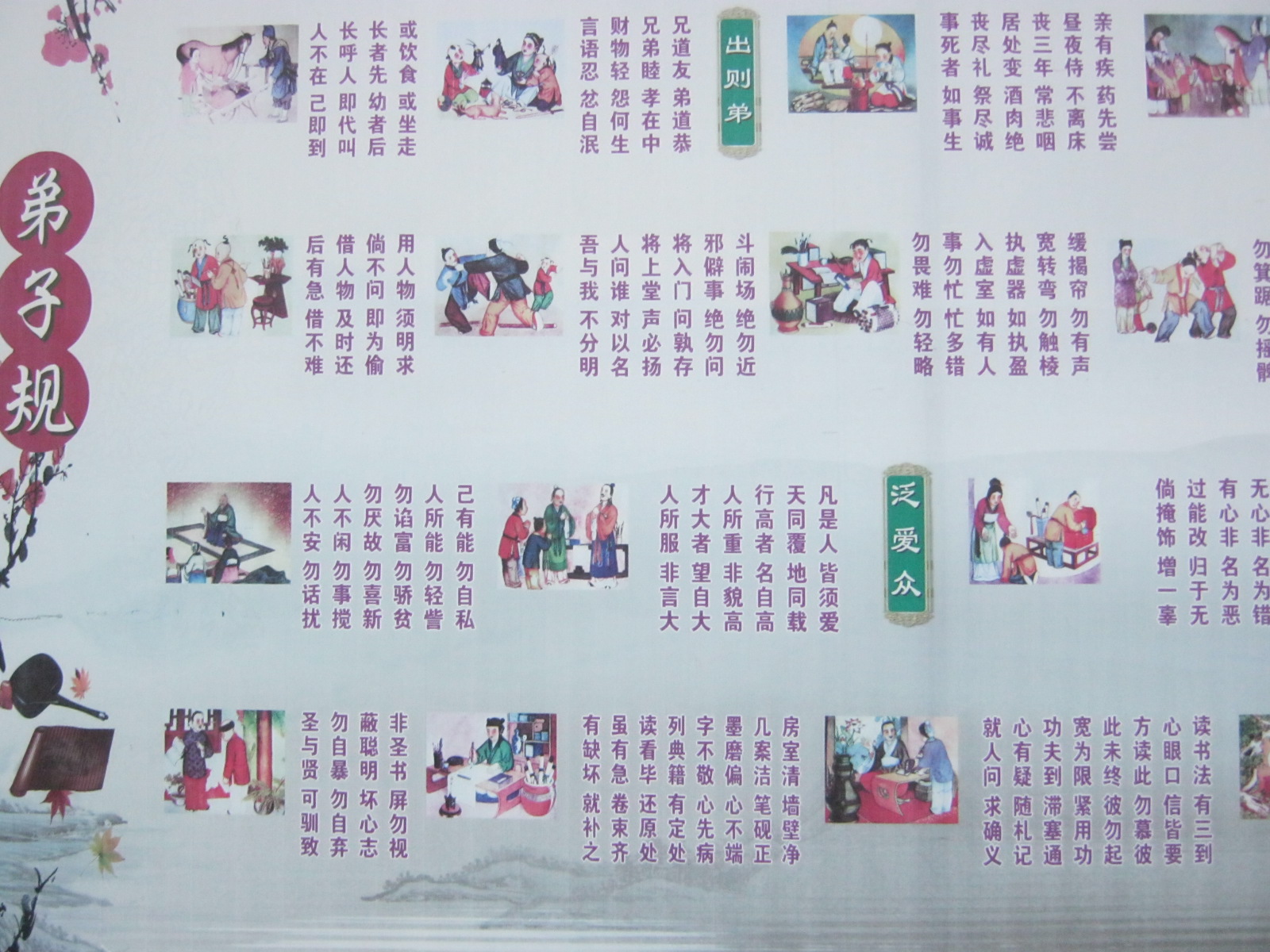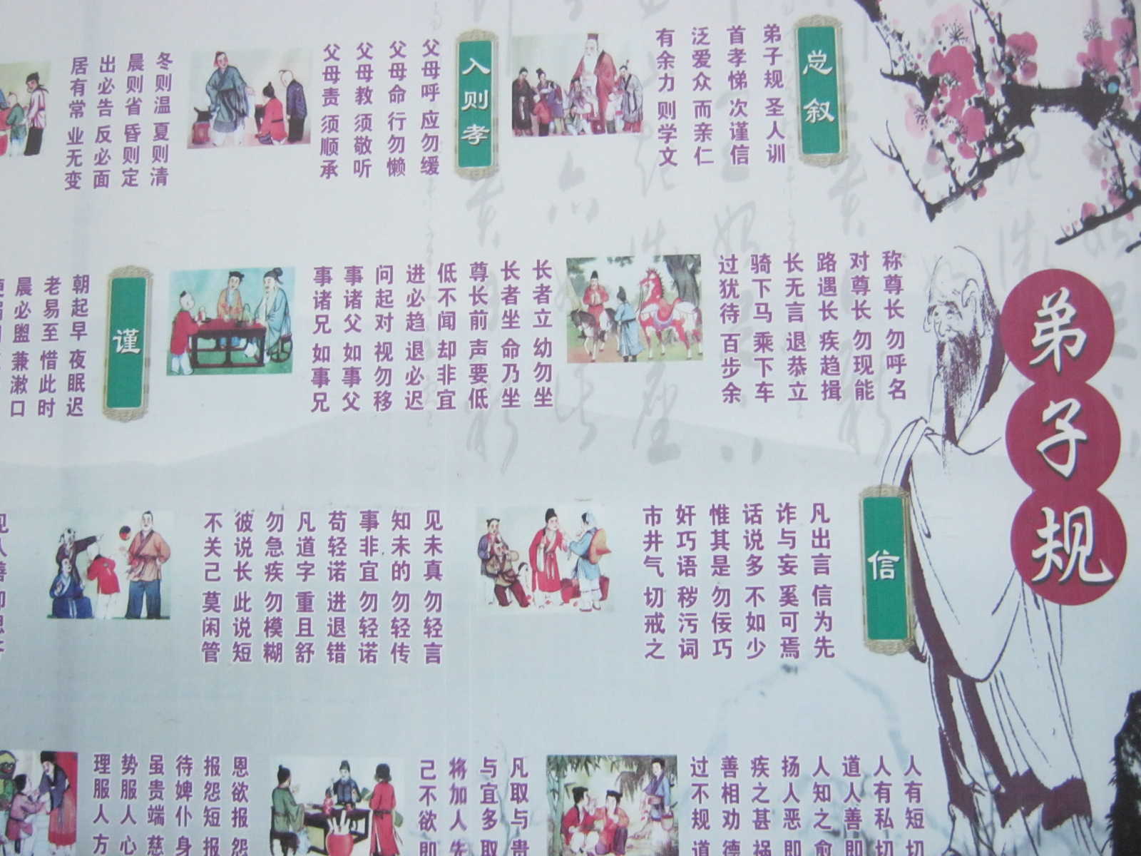 我们学校的文化墙其中一部分是《弟子规》的内容。说起弟子规我们并不陌生,现在从幼儿园就开始朗诵弟子规了。弟子规共有七章,第一章是入则孝,第二章是出则悌,第三章是谨,第四章是信,第五章是泛爱众,第六章是亲仁,第七章是余力学文。