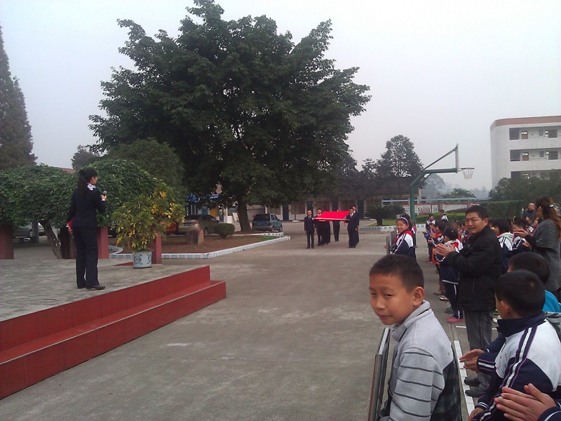 音乐响起,四个教师举着国旗,精神抖擞地迈着整齐的步伐走向旗台,随着国歌的响起,国旗缓缓上升。