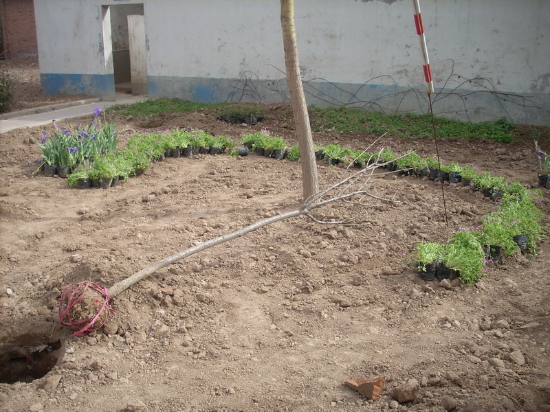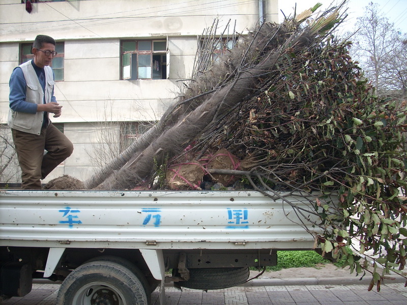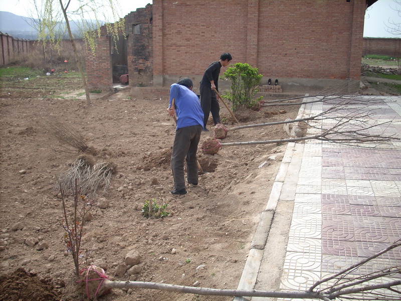 运送的花木种类繁多。许多花木我们以前并不认识,但听绿化人员说,这些花木开花之后,很漂亮的。他们一边运送,这边另外一批工人已经开始平整地面,开挖树坑。