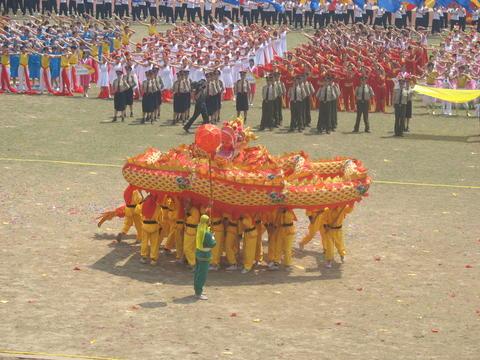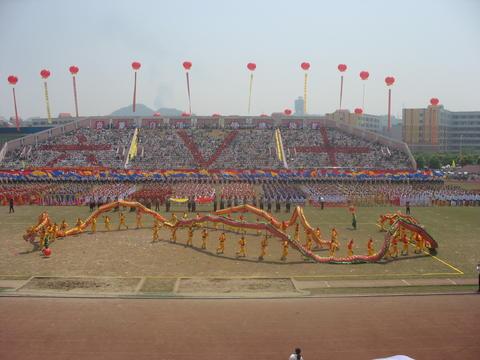 这是我去年在绵洋的一所大学里,看到它们举办校庆的时候所拍到的景像。当时真的很热闹,最先上场的是舞龙的队伍。只看长长的龙,在舞龙队员的手中表现的活灵活现。我不由看的入神,这么盛大的场面还是我头一次看到。不尽是我,几乎所有的观众都看的着了迷。