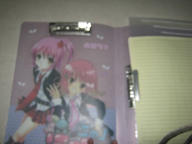 书夹的整体色彩是紫色的,正面是两个美少女,时尚的穿着,粉红色的头发,特别可爱。尤其那两双乌黑透亮的大眼睛,仿佛在审视你的一举一动;其中一个张着那樱桃小嘴,好像一直在说我。