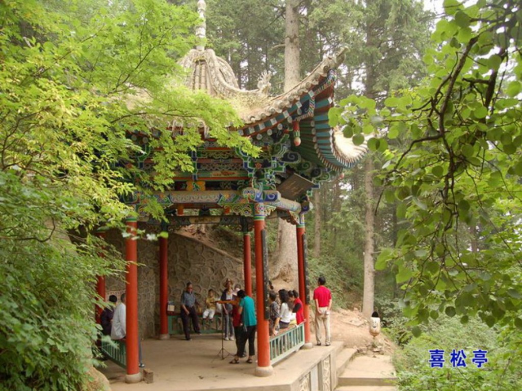 1942年,国民党爱国将领张治中先生来山游览,爱兴隆山松之高洁,捐资兴建。后亲笔题名“喜松亭”,同行甘肃省教育厅厅长水梓先生撰联“静调琴吟听流水,更历岁寒爱老松。”
