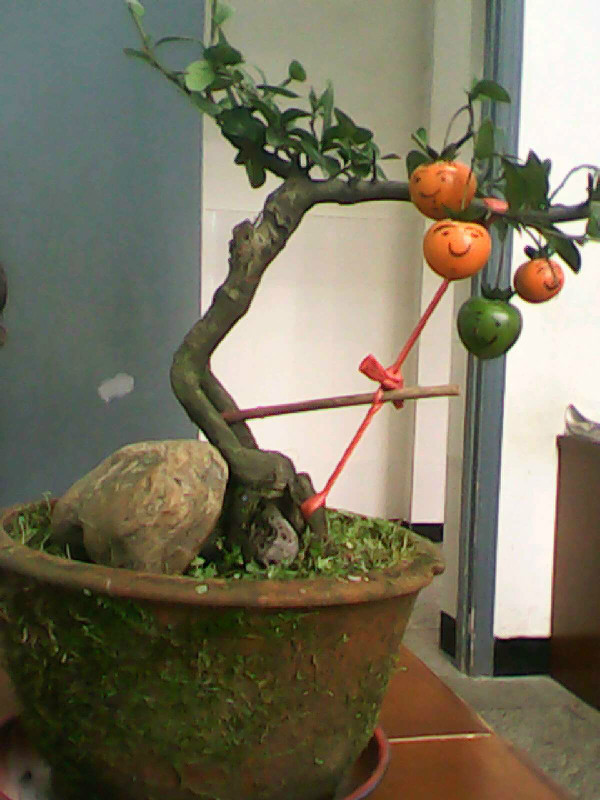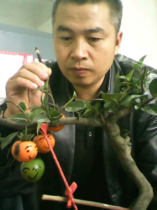 大喜老师每天都会把他种的花草搬一些到学校,放到老师们的办公桌上,他说这样不管春夏秋冬,走进办公室都会有春意盎然的感觉。他的盆栽非常有创意,他的一个盆栽里面种了一棵小金桔,一棵小苹果,一棵小腊梅,他给取的名字叫"金瓶梅";还有一盆"金弹子",当它的果实红了的时候,大喜老师就用毛笔给它们一个个都画上笑脸,然后放在办公桌上,进办公室的每个人看到都会开心的笑一笑。